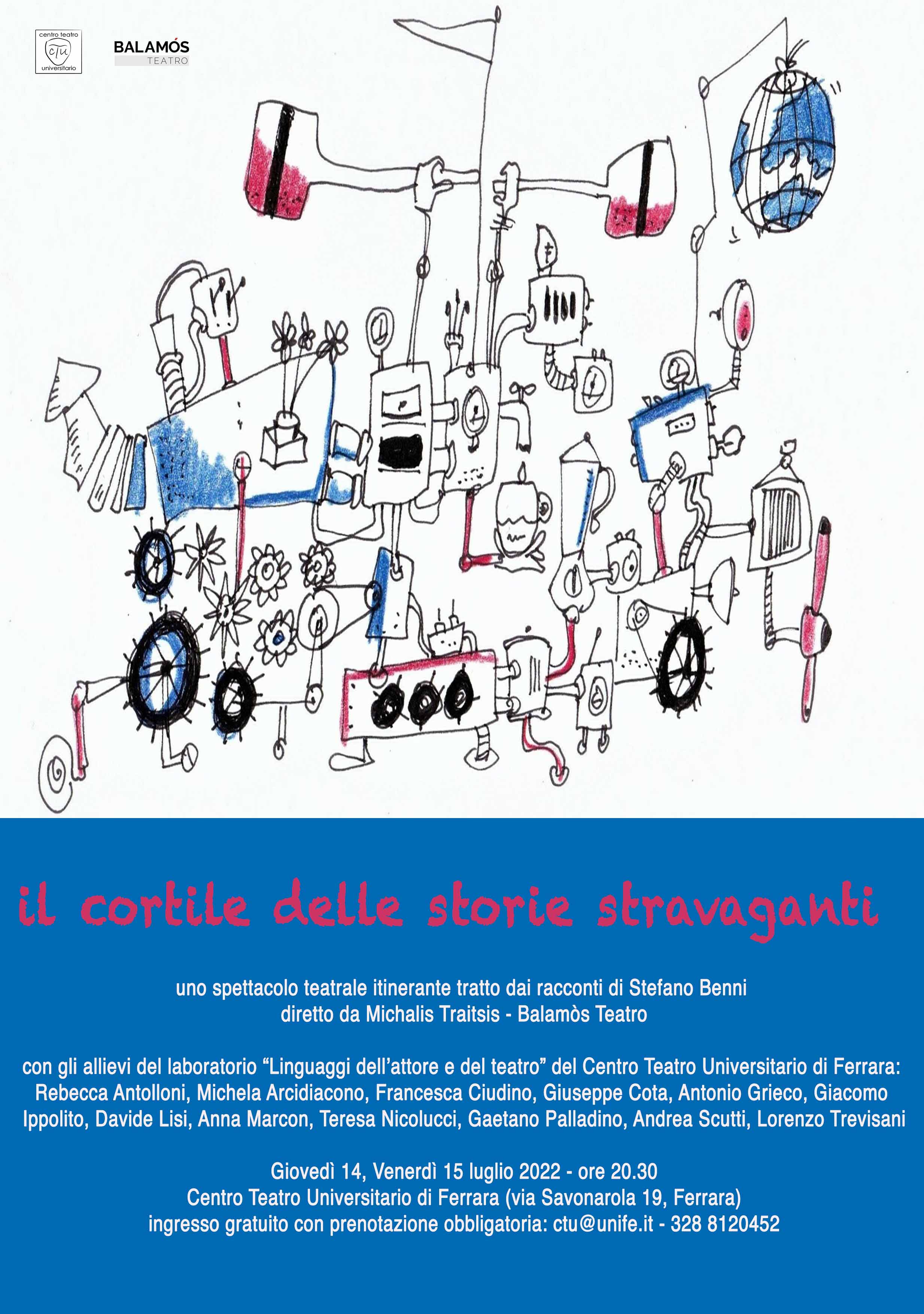 Giovedì 14 e Venerdì 15 Luglio 2022 si conclude il laboratorio annuale del Centro Teatro Universitario Linguaggi dell’attore e del teatro, con la presentazione dello spettacolo itinerante di narrazione Il cortile delle storie stravaganti.
